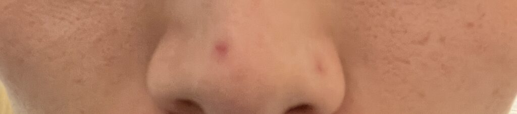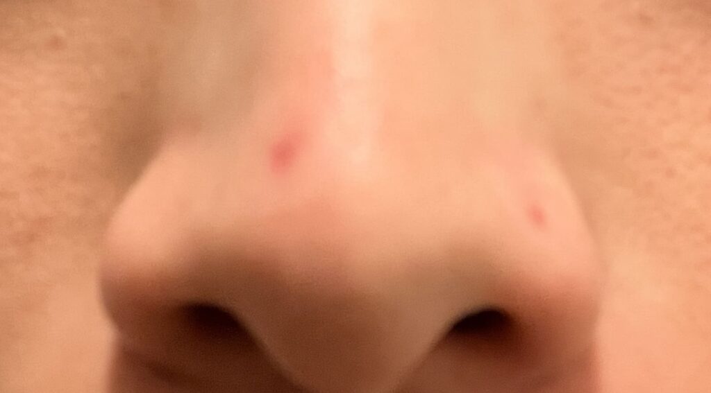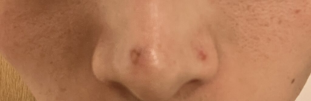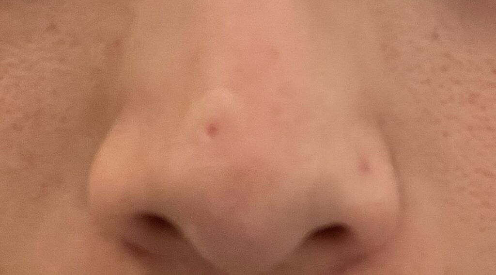 上記したように順調に改善していましたが、ある日、ふと鼻を見ると濃い方のほくろ跡が血豆のように黒くなってしまっていました。トラブル発生です。ほくろ除去しても再度ほくろができてしまう事例があることは知っていたので、心配になり、急いでおおしま皮膚科に行きました。