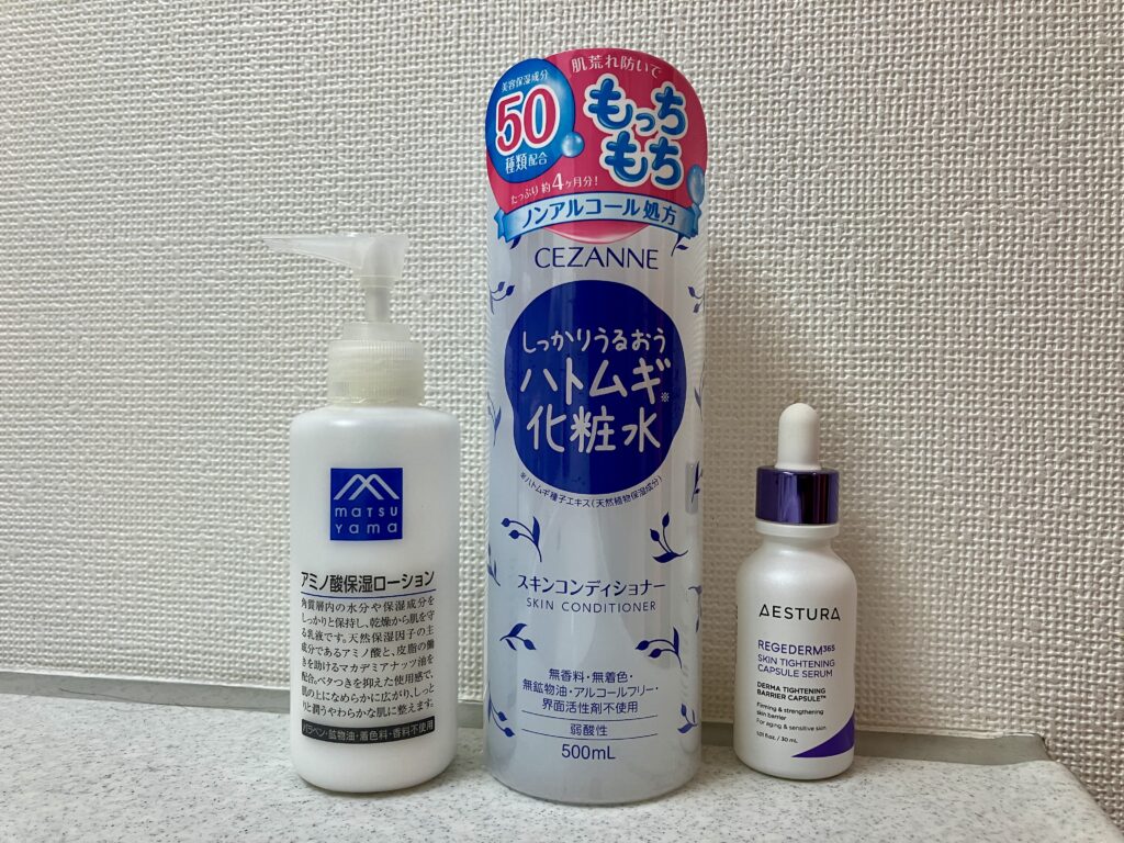 特に高額な化粧品は用意せず、もともと使っていた化粧品を引き続き使用しました。実際に使用していた化粧品は↓こちらです。朝晩使用して保湿していました。