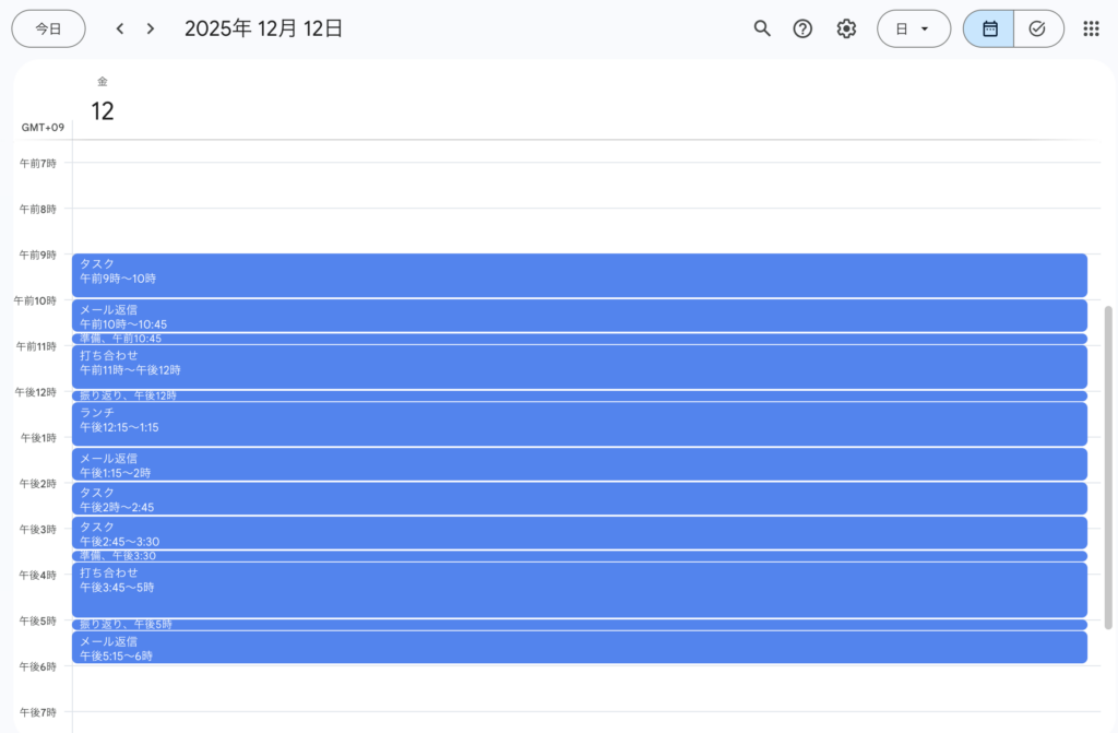 業務が始まった時には、Googleカレンダーに今日1日の予定が全て埋まっている状態を作っています。これにより、二つの効果があります。①今日1日「次何やろうか」と迷う時間がなくなる。②1日の流れを一度イメージするため動きやすくなる。といった効果です。体感的にTodoリストを整理しただけでは、これらの効果を得られません。カレンダーに予定としてタスクを突っ込むことで、業務の開始から終わりまで止まらずに走り切ることができると思います。